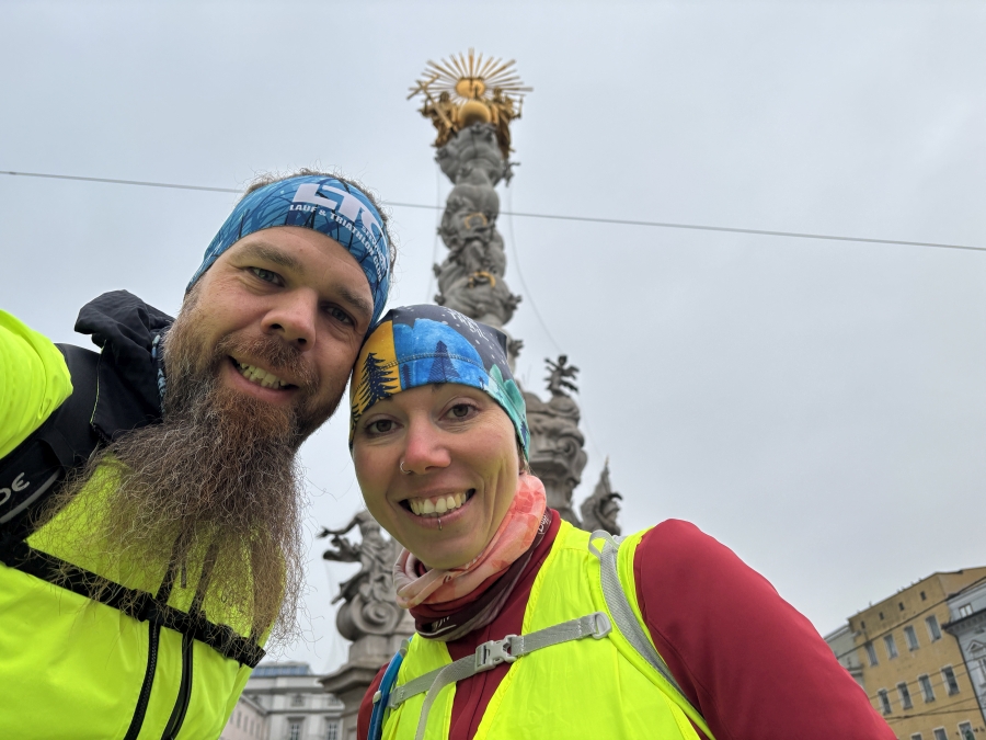 Bei der Ortstafel „Bad Leonfelden“ sind wir froh, dass es nun vorbei ist. Gleich beim Reinlaufen in die Ortschaft entscheiden wir uns dafür, dass wir nach 35 km gleich ins Gasthaus laufen und daher nur die „Hero“ variante bestreiten- auf den Sternstein laufen wir nicht mehr. Somit geben wir das Gasthaus ins Handynavi ein und laufen Richtung „Berggasthof Waldschenke“ Bei 39km stellen wir uns die Frage ob sich Christoph so verschätzt, hat bei der Streckenabmessung. Die komplette Strecke war so unmissverständlich markiert, dass das ja fast nicht möglich ist sich zu verlaufen oder eine Abzweigung zu übersehen. Horst kontrolliert nochmal die Anmeldung- Berggasthof Waldschenke ist nur für den Herbstlauf das Ziel- Wir müssen in den Leonfeldnerhof, den wir bereits 4 km hinter uns gebracht haben- Tja wer lesen kann ist klar im Vorteil. Aber nun ist uns die Entscheidung abgenommen worden- jetzt geht’s am Sternstein auch noch rauf- Ein Foto vor der Warte muss schon sein.