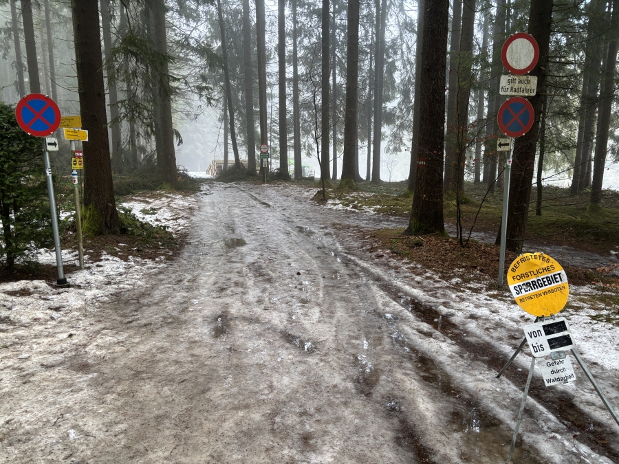 Und dann wird’s spannend. Dass überall Bäume umgefallen und umgesägt wurden ist uns ja schon aufgefallen, doch plötzlich stehen wir am Anfang eines forstlichen Sperrgebiets. Wir schauen uns kurz um- ein anderer Weg ist nicht in Sicht. Wir hören nichts und sehen keine Arbeiter. Also laufen wir mit mulmigem Gefühl durch. Gott sei dank ist die Sperrzone nicht lange und schon geht’s weiter.