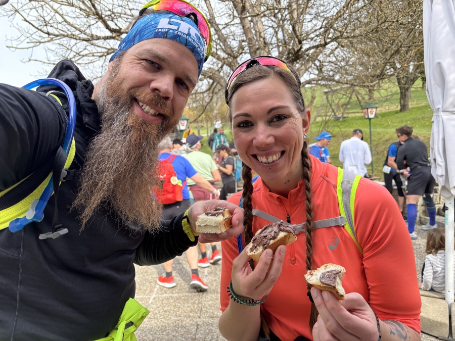Wir starten relativ gut los. In der Ebene und Berg ab laufen wir. Alles, was Berg- auf geht gehen wir, um uns die tolle Landschaft und die megageile Häuser anzuschauen. (Nicht weil wir immer noch nicht bergauf laufen können 😊 ) Und natürlich müssen wir „Schali“ ja auch die Gegend zeigen 🤣… da können wir nicht so einfach durchflitzen…. So verfliegen die KM und wir kommen bei der ersten Labe – Der Gis- gut an. Hier gibt’s gleich mal Schokowaffeln und Iso. Ein Highlight in der Fastenzeit, die wir heuer ganz besonders ernst nehmen und auf jegliches Naschzeug verzichten. Beim Donautrail allerdings machen wir jedes Jahr eine Ausnahme!