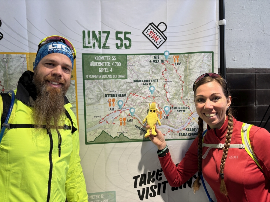 Um 8 Uhr morgens starten wir los. Wir sind wettertechnisch etwas verunsichert. Ein wunderschöner Tag mit 15 Grad ist angesagt, aber da wir ja wissen, dass wir bis zum Sonnenuntergang unterwegs sein werden, haben wir trotzdem langes Gwand und Jacke an. Zwiebellook ist bei einem Lauf wie diesem Pflicht auch wenn man dazwischen nimma weiß, wo man das ganze Zeug noch einpacken soll. 2L Trinkrucksack, 11 Gels, Stirnlampe, Warnweste, Haube, Alubecher, erste Hilfe Paket…. Da schleppt man schon einiges mit sich rum, was das Wettkampfgewicht automatisch erhöht. Und wieder mal stellt sich die Frage, ob der Griff ins Naschkasterl wirklich so eine gute Idee war….Heuer können wir uns allerdings auch ein bissi rausreden. Wir haben von unserem Sohnemann einen Glücksbringer, „Schali“ mitbekommen. Und der war Schuld am erhöhten Wettkampfgewicht.